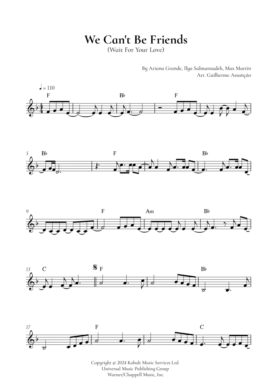 C Instrument - Level 1 - Digital Download SKU: A0.1401551 By Ariana Grande. By Ariana Grande, Ilya Salmanzadeh, and Max Martin. Arranged by Guilherme Assunção. 21st Century,Pop,Singer/Songwriter. Lead Sheet / Fake Book. 2 pages. Guilherme A. #984735. Published by Guilherme A. (A0.1401551). Unlock the Melodic Magic: Ariana Grande's 'We Can't Be Friends (Wait For Your Love)' Lead Sheet Now Available! Dive into the enchanting world of this hit song with our lead sheet arrangement. Perfect for musicians of all levels, this lead sheet provides the essential melody and chord symbols, allowing you to explore and interpret the song in your own unique style. Whether you're performing solo or leading a band, this lead sheet is your key to unlocking the captivating melodies of Ariana Grande's hit. Don't miss out on this opportunity to add a touch of magic to your repertoire. Grab your instrument and let the music guide you today! This product was created by a member of ArrangeMe, Hal Leonard's global self-publishing community of independent composers, arrangers, and songwriters. ArrangeMe allows for the publication of unique arrangements of popular titles and original compositions from a variety of voices and backgrounds. The length, difficulty, and retail pricing are determined solely by the discretion of the person who arranged or composed it. About Digital Downloads Digital Downloads are downloadable sheet music files that can be viewed directly on your computer, tablet or mobile device. Once you download your digital sheet music, you can view and print it at home, school, or anywhere you want to make music, and you don’t have to be connected to the internet. Just purchase, download and play! PLEASE NOTE: Your Digital Download will have a watermark at the bottom of each page that will include your name, purchase date and number of copies purchased. You are only authorized to print the number of copies that you have purchased. You may not digitally distribute or print more copies than purchased for use (i.e., you may not print or digitally distribute individual copies to friends or students).