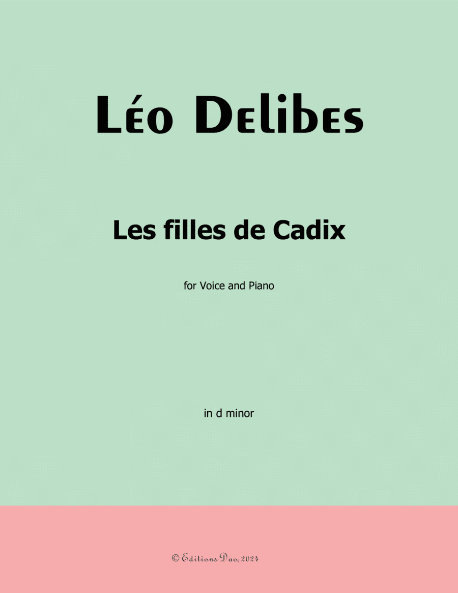Piano,Vocal,Voice - Level 3 - Digital Download SKU: A0.1385141 Composed by Leo Delibes. Arranged by Editions Dao. Classical. Score. 7 pages. Editions Dao #969147. Published by Editions Dao (A0.1385141). Les filles de Cadix by Delibes, for Voice and Piano.7 Pages. This product was created by a member of ArrangeMe, Hal Leonard's global self-publishing community of independent composers, arrangers, and songwriters. ArrangeMe allows for the publication of unique arrangements of popular titles and original compositions from a variety of voices and backgrounds. The length, difficulty, and retail pricing are determined solely by the discretion of the person who arranged or composed it. About Digital Downloads Digital Downloads are downloadable sheet music files that can be viewed directly on your computer, tablet or mobile device. Once you download your digital sheet music, you can view and print it at home, school, or anywhere you want to make music, and you don’t have to be connected to the internet. Just purchase, download and play! PLEASE NOTE: Your Digital Download will have a watermark at the bottom of each page that will include your name, purchase date and number of copies purchased. You are only authorized to print the number of copies that you have purchased. You may not digitally distribute or print more copies than purchased for use (i.e., you may not print or digitally distribute individual copies to friends or students).