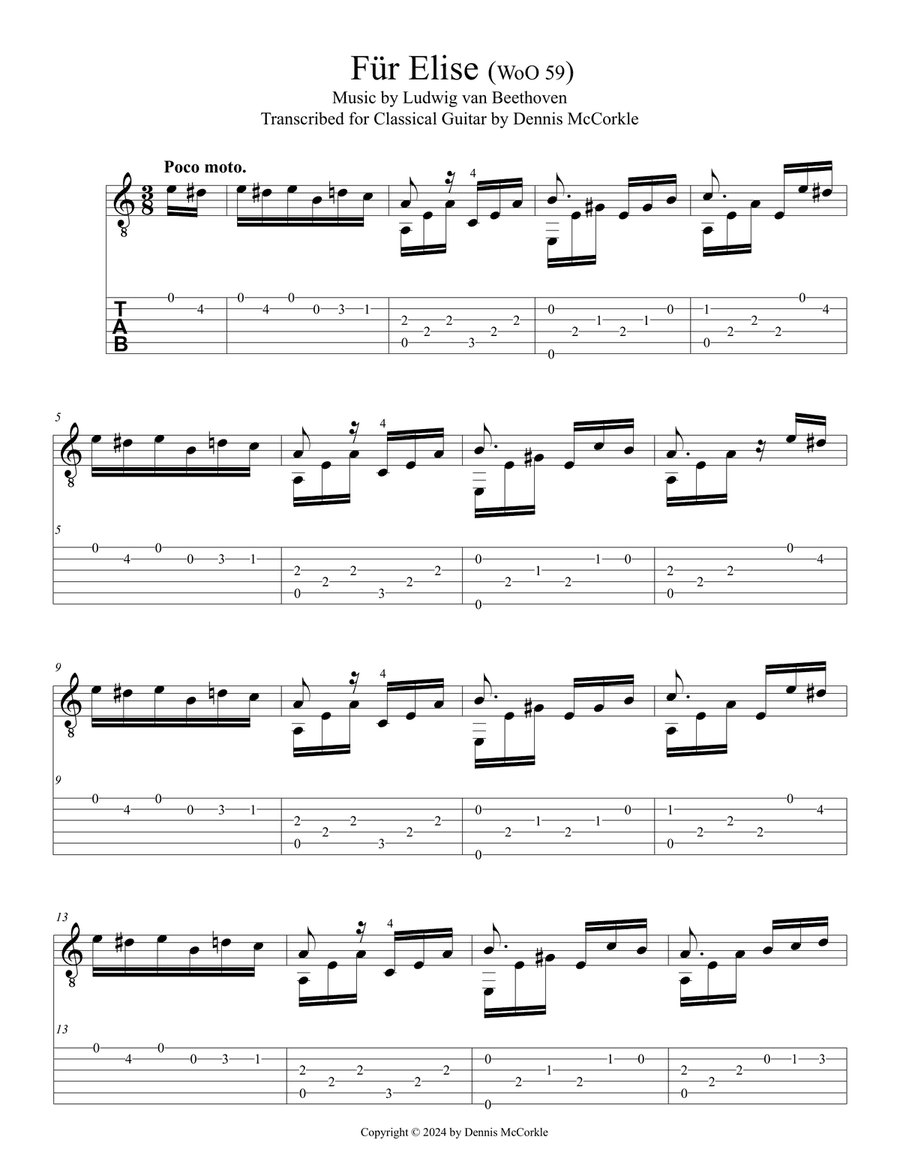 Guitar - Level 3 - Digital Download SKU: A0.1415684 Composed by Ludwig van Beethoven. Arranged by Dennis McCorkle. Classical,Instructional,Romantic Period. Guitar Tab. 9 pages. DF McCorkle Music and eBook Publications #997403. Published by DF McCorkle Music and eBook Publications (A0.1415684). This famous piano composition by Beethoven transcribed for Solo Classical Guitar by Dennis McCorkle (DennisMcCorkle.com). Includes main theme and suitable for intermediate studies. This product was created by a member of ArrangeMe, Hal Leonard's global self-publishing community of independent composers, arrangers, and songwriters. ArrangeMe allows for the publication of unique arrangements of popular titles and original compositions from a variety of voices and backgrounds. The length, difficulty, and retail pricing are determined solely by the discretion of the person who arranged or composed it. About Digital Downloads Digital Downloads are downloadable sheet music files that can be viewed directly on your computer, tablet or mobile device. Once you download your digital sheet music, you can view and print it at home, school, or anywhere you want to make music, and you don’t have to be connected to the internet. Just purchase, download and play! PLEASE NOTE: Your Digital Download will have a watermark at the bottom of each page that will include your name, purchase date and number of copies purchased. You are only authorized to print the number of copies that you have purchased. You may not digitally distribute or print more copies than purchased for use (i.e., you may not print or digitally distribute individual copies to friends or students).