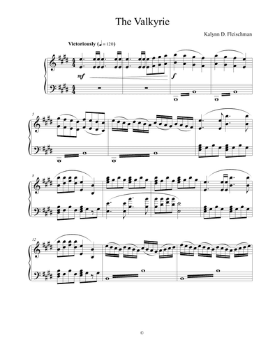 Piano Solo - Level 5 - Digital Download SKU: A0.1317394 By Kalynn Fleischman. By Kalynn Fleischman. Arranged by Kalynn Fleischman. 21st Century,Contemporary,Halloween,Instructional,Romantic Period. Score. 4 pages. Kalynn Fleischman #906056. Published by Kalynn Fleischman (A0.1317394). This is the tenth piece in a set of thirty all written in November of 2023. It is a trumphant and glorious piece for advanced players! This product was created by a member of ArrangeMe, Hal Leonard's global self-publishing community of independent composers, arrangers, and songwriters. ArrangeMe allows for the publication of unique arrangements of popular titles and original compositions from a variety of voices and backgrounds. The length, difficulty, and retail pricing are determined solely by the discretion of the person who arranged or composed it. About Digital Downloads Digital Downloads are downloadable sheet music files that can be viewed directly on your computer, tablet or mobile device. Once you download your digital sheet music, you can view and print it at home, school, or anywhere you want to make music, and you don’t have to be connected to the internet. Just purchase, download and play! PLEASE NOTE: Your Digital Download will have a watermark at the bottom of each page that will include your name, purchase date and number of copies purchased. You are only authorized to print the number of copies that you have purchased. You may not digitally distribute or print more copies than purchased for use (i.e., you may not print or digitally distribute individual copies to friends or students).