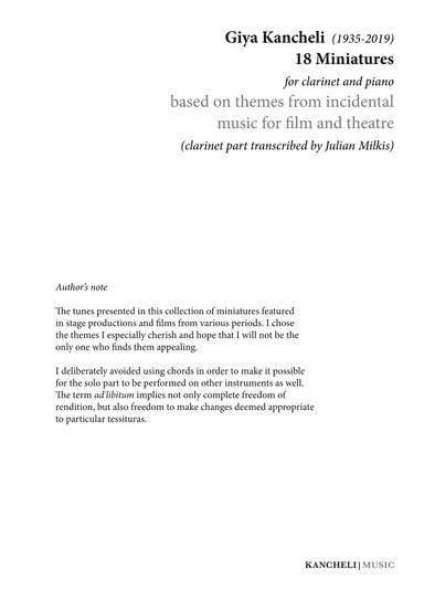 Vibraphone Solo - Digital Download SKU: A0.794897 Composed by Giya Kancheli. Arranged by Andrei Pushkarev. Contemporary,Film/TV. Individual part. 74 pages. KANCHELIMUSIC #6340661. Published by KANCHELIMUSIC (A0.794897). I am very happy to share this book with you: thirty-three miniatures by the great Georgian composer Giya Kancheli based on his music for theater and cinema. Originally, the miniatures were written for piano; I have transcribed them for solo vibraphone.I discovered Giya’s music as a member of Kremerata Baltica, the chamber orchestra spearheaded by the world-renowned violinist Gidon Kremer, with whom I have been collaborating for more than twenty years. Not only did I have the opportunity to perform the music of the Maestro - I was lucky to get to him know him well. Our first artistic encounter took place at Gidon Kremer’s Lockenhaus Chamber Music Festival in Austria, where Giya Kancheli had been a frequent composer-in-residence. He was a man of rare human warmth, sincerity, charm, passion and positive aura, with a wonderful sense of humor. At the same time it would be difficult to find a person more meticulous and demanding regarding the performance of his compositions, where every little detail matters.Giya said: "Whether my music is played matters less than the way it is played". When you open this book, you'll understand better what Maestro meant. His music is incrementally sensitive, every stroke, every change of harmony, even every rest carries its own expressive significance, its own mood, its own energy. A thoughtful approach to timing becomes the magic key to the interpretation of Kancheli’s works - in every period, in every measure and in every beat.The unique timbres and color capacities of the vibraphone, I am absolutely convinced, allow the performer and listener to immerse themselves in the majestic microcosm of extremely subtle, tender, and sublimely inspiring imagery that is the musical world of Giya Kancheli.I’m sure you will enjoy it!  Andrei Pushkarev This product was created by a member of ArrangeMe, Hal Leonard’s global self-publishing community of independent composers, arrangers, and songwriters. ArrangeMe allows for the publication of unique arrangements of both popular titles and original compositions from a wide variety of voices and backgrounds. About Digital Downloads Digital Downloads are downloadable sheet music files that can be viewed directly on your computer, tablet or mobile device. Once you download your digital sheet music, you can view and print it at home, school, or anywhere you want to make music, and you don’t have to be connected to the internet. Just purchase, download and play! PLEASE NOTE: Your Digital Download will have a watermark at the bottom of each page that will include your name, purchase date and number of copies purchased. You are only authorized to print the number of copies that you have purchased. You may not digitally distribute or print more copies than purchased for use (i.e., you may not print or digitally distribute individual copies to friends or students).