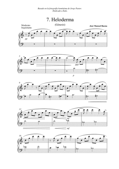 Piano Solo - Level 3 - Digital Download SKU: A0.1021807 Composed by José Manuel Baena Herrera. 20th Century,Contemporary,New Age,Video Game. Score. 2 pages. Jose Manuel Baena Herrera #6201573. Published by Jose Manuel Baena Herrera (A0.1021807). Septimo preludio de la serie Génesis. 8 Preludios para piano sólo. This product was created by a member of ArrangeMe, Hal Leonard's global self-publishing community of independent composers, arrangers, and songwriters. ArrangeMe allows for the publication of unique arrangements of popular titles and original compositions from a variety of voices and backgrounds. The length, difficulty, and retail pricing are determined solely by the discretion of the person who arranged or composed it. About Digital Downloads Digital Downloads are downloadable sheet music files that can be viewed directly on your computer, tablet or mobile device. Once you download your digital sheet music, you can view and print it at home, school, or anywhere you want to make music, and you don’t have to be connected to the internet. Just purchase, download and play! PLEASE NOTE: Your Digital Download will have a watermark at the bottom of each page that will include your name, purchase date and number of copies purchased. You are only authorized to print the number of copies that you have purchased. You may not digitally distribute or print more copies than purchased for use (i.e., you may not print or digitally distribute individual copies to friends or students).