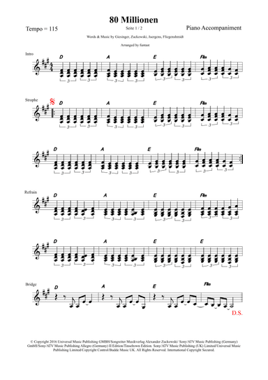 Piano Solo - Level 3 - Digital Download SKU: A0.1103028 Composed by Fliegenshmidt, Giesinger, Juergens, and Zuckowski. Arranged by funtast. Pop. Score. 2 pages. Funtast #706357. Published by funtast (A0.1103028). Piano Accompaniment, no Lyrics, Original Key. This product was created by a member of ArrangeMe, Hal Leonard’s global self-publishing community of independent composers, arrangers, and songwriters. ArrangeMe allows for the publication of unique arrangements of both popular titles and original compositions from a wide variety of voices and backgrounds. About Digital Downloads Digital Downloads are downloadable sheet music files that can be viewed directly on your computer, tablet or mobile device. Once you download your digital sheet music, you can view and print it at home, school, or anywhere you want to make music, and you don’t have to be connected to the internet. Just purchase, download and play! PLEASE NOTE: Your Digital Download will have a watermark at the bottom of each page that will include your name, purchase date and number of copies purchased. You are only authorized to print the number of copies that you have purchased. You may not digitally distribute or print more copies than purchased for use (i.e., you may not print or digitally distribute individual copies to friends or students).