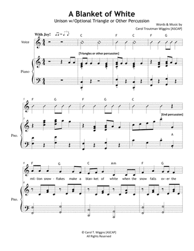 Choral Choir (Unison) - Level 1 - Digital Download SKU: A0.727278 Composed by Carol Troutman Wiggins. Children,Christmas,Contemporary,Holiday,Instructional. Octavo. 3 pages. Carol Troutman Wiggins #3429545. Published by Carol Troutman Wiggins (A0.727278). A BLANKET OF WHITEUnison w/Optional Triangle or Other PercussionNeed a quick & easy upbeat, bouncy song about winter or snow? This cute, happy song adds optional triangles or other percussion instruments - whatever you have on hand.Excellent for any age elementary through middle school studentsGreat for use as a winter program pieceEasy melodyIntermediate level accompanimentAdd triangle or other percussion instrumement - whatever you have on handPercussion cues included in scoreRepetitive lyricsChords included for additional instruments (Ukulele would be so precious!)Piano Accompaniment/Rehearsal Track included on this site. This product was created by a member of ArrangeMe, Hal Leonard's global self-publishing community of independent composers, arrangers, and songwriters. ArrangeMe allows for the publication of unique arrangements of popular titles and original compositions from a variety of voices and backgrounds. The length, difficulty, and retail pricing are determined solely by the discretion of the person who arranged or composed it. About Digital Downloads Digital Downloads are downloadable sheet music files that can be viewed directly on your computer, tablet or mobile device. Once you download your digital sheet music, you can view and print it at home, school, or anywhere you want to make music, and you don’t have to be connected to the internet. Just purchase, download and play! PLEASE NOTE: Your Digital Download will have a watermark at the bottom of each page that will include your name, purchase date and number of copies purchased. You are only authorized to print the number of copies that you have purchased. You may not digitally distribute or print more copies than purchased for use (i.e., you may not print or digitally distribute individual copies to friends or students).