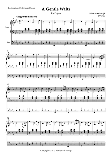 Organ - Level 3 - Digital Download SKU: A0.1224813 Composed by Rien Schalkwijk. 21st Century,Contemporary,Folk,Praise & Worship,Traditional. Score. 4 pages. Rien Schalkwijk #820925. Published by Rien Schalkwijk (A0.1224813). Indulge in the soothing melodies of this beautiful waltz for pipe organ in E flat major. This delightful piece is perfect for those seeking a relaxing and uplifting musical experience. The flowing melody of the first and last part will transport you to a peaceful and serene state of mind, while the quick and skillful passages in between will captivate your attention and showcase the technical prowess of the performer. Whether you are a seasoned organist or an amateur musician, this waltz is sure to delight and inspire. So, come and experience the joy of music with this enchanting piece for pipe organ! This product was created by a member of ArrangeMe, Hal Leonard's global self-publishing community of independent composers, arrangers, and songwriters. ArrangeMe allows for the publication of unique arrangements of popular titles and original compositions from a variety of voices and backgrounds. The length, difficulty, and retail pricing are determined solely by the discretion of the person who arranged or composed it. About Digital Downloads Digital Downloads are downloadable sheet music files that can be viewed directly on your computer, tablet or mobile device. Once you download your digital sheet music, you can view and print it at home, school, or anywhere you want to make music, and you don’t have to be connected to the internet. Just purchase, download and play! PLEASE NOTE: Your Digital Download will have a watermark at the bottom of each page that will include your name, purchase date and number of copies purchased. You are only authorized to print the number of copies that you have purchased. You may not digitally distribute or print more copies than purchased for use (i.e., you may not print or digitally distribute individual copies to friends or students).