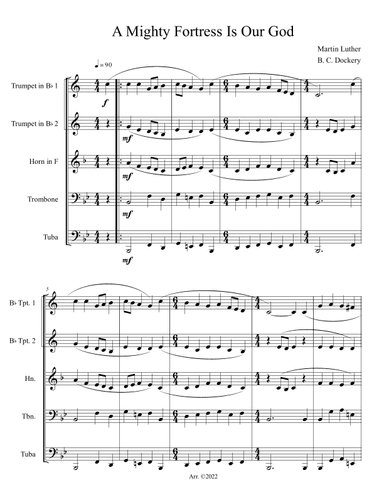 Brass Ensemble Horn,Trombone,Trumpet,Tuba - Level 2 - Digital Download SKU: A0.1042109 Composed by Martin Luther. Arranged by B. C. Dockery. Baroque,Sacred. Score and parts. 7 pages. Ben Dockery #646907. Published by Ben Dockery (A0.1042109). Arranged for brass quintet: 2 Bb trumpets, french horn, trombone, and tuba. Great for offertories, preludes, postludes, and recitals. Early intermediate level. Includes score and parts. This product was created by a member of ArrangeMe, Hal Leonard's global self-publishing community of independent composers, arrangers, and songwriters. ArrangeMe allows for the publication of unique arrangements of popular titles and original compositions from a variety of voices and backgrounds. The length, difficulty, and retail pricing are determined solely by the discretion of the person who arranged or composed it. About Digital Downloads Digital Downloads are downloadable sheet music files that can be viewed directly on your computer, tablet or mobile device. Once you download your digital sheet music, you can view and print it at home, school, or anywhere you want to make music, and you don’t have to be connected to the internet. Just purchase, download and play! PLEASE NOTE: Your Digital Download will have a watermark at the bottom of each page that will include your name, purchase date and number of copies purchased. You are only authorized to print the number of copies that you have purchased. You may not digitally distribute or print more copies than purchased for use (i.e., you may not print or digitally distribute individual copies to friends or students).
