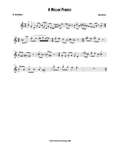 Small Ensemble Soprano Saxophone,Tenor Saxophone,Trumpet - Level 5 - Digital Download SKU: A0.1007319 Composed by Chris Kelsey. Contemporary,Instructional,Jazz. Score and parts. 1 pages. Chris Kelsey Publishing, BMI #3112049. Published by Chris Kelsey Publishing, BMI (A0.1007319). A jazz line in the tradition of Ornette Coleman, in which the harmonies are irregular and provisional, not specified. For performance purposes, it can be interpreted loosely. Tempo can be as slow or as fast as desired. Time signatures are included for purposes of phrasing and are not necessarily meant to be strictly adhered to. If used as an etude, it may be helpful to treat the time in a stricter manner and work to play as fast as possible. The work is in large party built on unpredictable and/or unusual intervallic and chordal relationships, the mastery of which can only strengthen the player's technique. For performance cues listen to such Ornette compositions as "Change of the Century" and "Moon Inhabitants.". This product was created by a member of ArrangeMe, Hal Leonard's global self-publishing community of independent composers, arrangers, and songwriters. ArrangeMe allows for the publication of unique arrangements of popular titles and original compositions from a variety of voices and backgrounds. The length, difficulty, and retail pricing are determined solely by the discretion of the person who arranged or composed it. About Digital Downloads Digital Downloads are downloadable sheet music files that can be viewed directly on your computer, tablet or mobile device. Once you download your digital sheet music, you can view and print it at home, school, or anywhere you want to make music, and you don’t have to be connected to the internet. Just purchase, download and play! PLEASE NOTE: Your Digital Download will have a watermark at the bottom of each page that will include your name, purchase date and number of copies purchased. You are only authorized to print the number of copies that you have purchased. You may not digitally distribute or print more copies than purchased for use (i.e., you may not print or digitally distribute individual copies to friends or students).