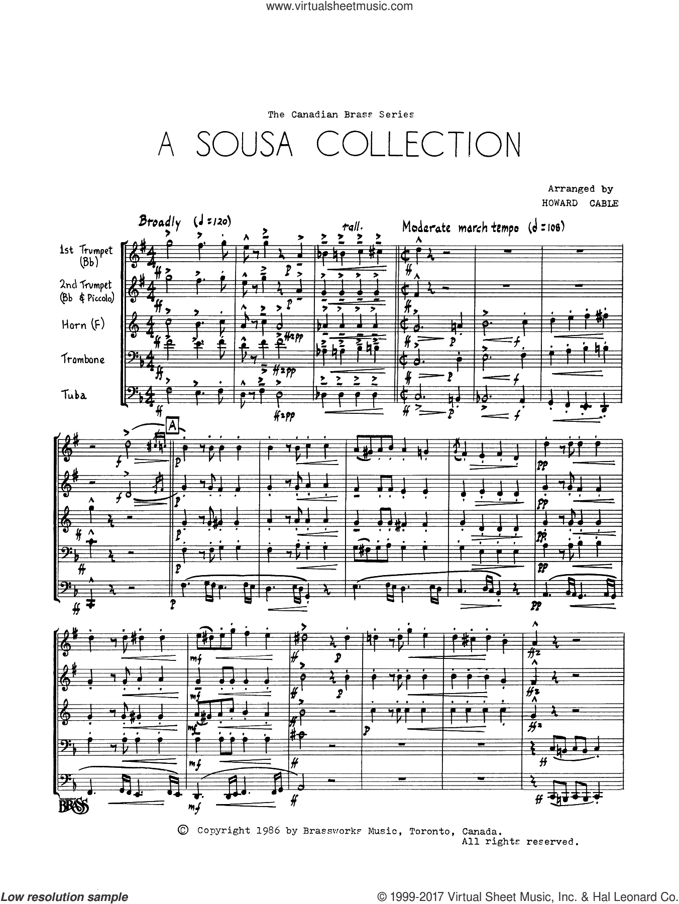 Digital sheet music for brass quintet, complete collection. Look at what parts are included below to understand exactly the instrumentation of this piece. More info from the publisherPublisher: Hal LeonardContributors to this music title:Howard Cable (writer)This item includes: PDF (digital sheet music to download and print)Instrumentation:brass quintetSkill Level:intermediateGenre:patriotic, festivalTotal Pages:56