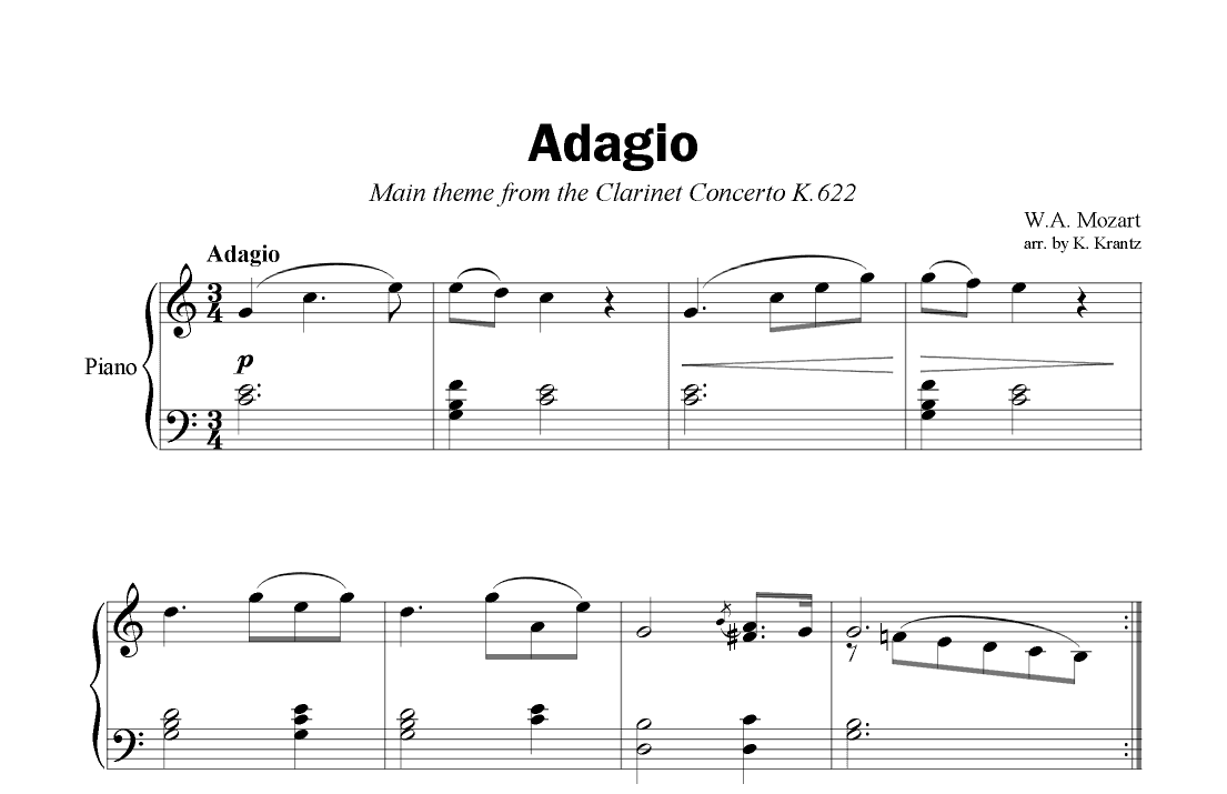 Adagio from the clarinet concerto (theme) for easy piano solo (arr. K. Krantz)