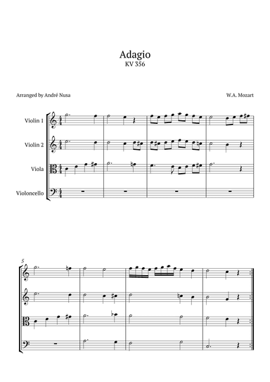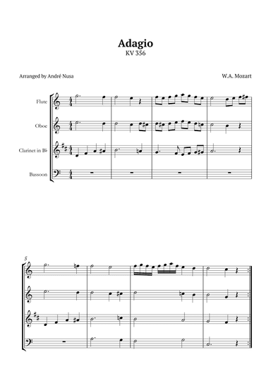 Woodwind Ensemble,Woodwind Quartet Bassoon,Clarinet,Flute,Oboe - Level 3 - Digital Download SKU: A0.1249169 Composed by Wolfgang Amadeus Mozart. Arranged by André Nusa. Chamber,Classical. 7 pages. Andre_Nusa #843632. Published by Andre_Nusa (A0.1249169). Elevate your musical performances with the exquisite arrangement of Mozart's Adagio KV356 for woodwind quartet. Immerse yourself in the beauty and emotional depth of this renowned composition as it unfolds through the interplay of flute, oboe, clarinet and bassoon. From the tender melodies to the rich harmonies, experience the timeless elegance of Mozart's music in a new light. Perfect for intermediate students, this arrangement captures the essence of the original work while showcasing the versatility and expressive capabilities of woodwind instruments. Delve into the nuanced phrasing and delicate dynamics as you bring Mozart's masterful composition to life. Embrace the artistry of the woodwind quartet and discover the true essence of classical music. Whether for performance or personal enjoyment, this arrangement is a must-have addition to any string quartet repertoire. This product was created by a member of ArrangeMe, Hal Leonard’s global self-publishing community of independent composers, arrangers, and songwriters. ArrangeMe allows for the publication of unique arrangements of both popular titles and original compositions from a wide variety of voices and backgrounds. About Digital Downloads Digital Downloads are downloadable sheet music files that can be viewed directly on your computer, tablet or mobile device. Once you download your digital sheet music, you can view and print it at home, school, or anywhere you want to make music, and you don’t have to be connected to the internet. Just purchase, download and play! PLEASE NOTE: Your Digital Download will have a watermark at the bottom of each page that will include your name, purchase date and number of copies purchased. You are only authorized to print the number of copies that you have purchased. You may not digitally distribute or print more copies than purchased for use (i.e., you may not print or digitally distribute individual copies to friends or students).