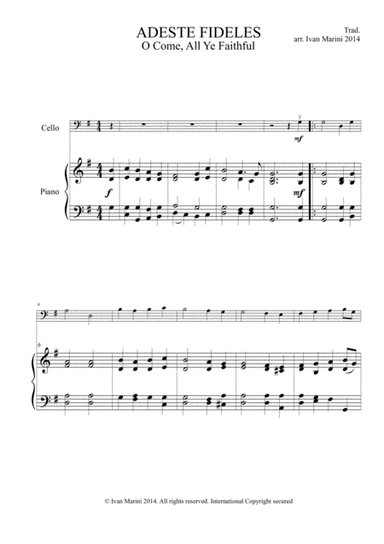 Cello,Piano - Level 1 - Digital Download SKU: A0.1097038 Composed by John Francis Wade and John Reading. Arranged by Vitor Melo. Christian,Christmas,Classical,Holiday,Religious. Score and part. 2 pages. Melo Music #701005. Published by Melo Music (A0.1097038). "O Come, All Ye Faithful" (originally spelled in Latin as "Adeste Fideles") is a famous Christmas song that has been attributed to various authors. This beautiful hymn was first published by John Francis Wade in his collection Cantus Diversi (1751), with four Latin verses, and music set in the traditional square notation used for medieval liturgical music. Besides John Reading and John Francis Wade, the tune has been attributed to several musicians, from Handel to the German composer Gluck. The Portuguese composer Marcos Portugal or King John IV of Portugal have also been credited. Thomas Arne, whom Wade knew, is another possible composer. This arrangement features an easy-to-play violoncello version, with piano accompaniment and chords, for optional guitar accompaniment. Easy level. Key: G Major. This product was created by a member of ArrangeMe, Hal Leonard’s global self-publishing community of independent composers, arrangers, and songwriters. ArrangeMe allows for the publication of unique arrangements of both popular titles and original compositions from a wide variety of voices and backgrounds. About Digital Downloads Digital Downloads are downloadable sheet music files that can be viewed directly on your computer, tablet or mobile device. Once you download your digital sheet music, you can view and print it at home, school, or anywhere you want to make music, and you don’t have to be connected to the internet. Just purchase, download and play! PLEASE NOTE: Your Digital Download will have a watermark at the bottom of each page that will include your name, purchase date and number of copies purchased. You are only authorized to print the number of copies that you have purchased. You may not digitally distribute or print more copies than purchased for use (i.e., you may not print or digitally distribute individual copies to friends or students).