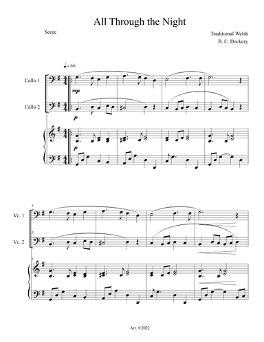 Cello Duet Cello - Level 2 - Digital Download SKU: A0.1119770 Composed by Traditional. Arranged by B. C. Dockery. Christian,Christmas,Folk,Holiday,Traditional. Score. 5 pages. Ben Dockery #721111. Published by Ben Dockery (A0.1119770). Also known in Welsh as "Ar Hyd y Nos." Arranged for two cellos with piano accompaniment. Great for lessons, recitals, Christmas programs, parties, and caroling. Easy intermediate level. Includes score and parts. This product was created by a member of ArrangeMe, Hal Leonard’s global self-publishing community of independent composers, arrangers, and songwriters. ArrangeMe allows for the publication of unique arrangements of both popular titles and original compositions from a wide variety of voices and backgrounds. About Digital Downloads Digital Downloads are downloadable sheet music files that can be viewed directly on your computer, tablet or mobile device. Once you download your digital sheet music, you can view and print it at home, school, or anywhere you want to make music, and you don’t have to be connected to the internet. Just purchase, download and play! PLEASE NOTE: Your Digital Download will have a watermark at the bottom of each page that will include your name, purchase date and number of copies purchased. You are only authorized to print the number of copies that you have purchased. You may not digitally distribute or print more copies than purchased for use (i.e., you may not print or digitally distribute individual copies to friends or students).
