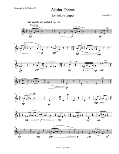 B-Flat Trumpet Solo,C Trumpet Solo - Level 4 - Digital Download SKU: A0.1180406 Composed by Aaron Lee. 20th Century,Chamber,Classical,Contemporary. Individual part. 3 pages. J. Aaron Lee #780305. Published by J. Aaron Lee (A0.1180406). "Alpha Decay" is a short work (approx 3 minutes) for solo trumpet and can be played on either B-flat or C trumpet. The title comes from a subtype of radioactive decay in which an alpha particle (two neutrons and two protons) is emited as a cluster. In a similar way, a central motif in this work "emits" fragments that come flying off of it. This work is moderately difficult and could be suitable for advanced students. For more music from Aaron Lee, you can visit www.MusicOfLee.com. This product was created by a member of ArrangeMe, Hal Leonard’s global self-publishing community of independent composers, arrangers, and songwriters. ArrangeMe allows for the publication of unique arrangements of both popular titles and original compositions from a wide variety of voices and backgrounds. About Digital Downloads Digital Downloads are downloadable sheet music files that can be viewed directly on your computer, tablet or mobile device. Once you download your digital sheet music, you can view and print it at home, school, or anywhere you want to make music, and you don’t have to be connected to the internet. Just purchase, download and play! PLEASE NOTE: Your Digital Download will have a watermark at the bottom of each page that will include your name, purchase date and number of copies purchased. You are only authorized to print the number of copies that you have purchased. You may not digitally distribute or print more copies than purchased for use (i.e., you may not print or digitally distribute individual copies to friends or students).