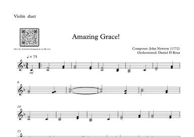 Violin Duet Violin - Level 1 - Digital Download SKU: A0.1151719 Composed by John Newton. Arranged by Daniel H Rosa. Children,Christian,Easter,Religious,Sacred. 1 pages. Daniel H Rosa #751918. Published by Daniel H Rosa (A0.1151719). Easy Begginer arrangement. This product was created by a member of ArrangeMe, Hal Leonard's global self-publishing community of independent composers, arrangers, and songwriters. ArrangeMe allows for the publication of unique arrangements of popular titles and original compositions from a variety of voices and backgrounds. The length, difficulty, and retail pricing are determined solely by the discretion of the person who arranged or composed it. About Digital Downloads Digital Downloads are downloadable sheet music files that can be viewed directly on your computer, tablet or mobile device. Once you download your digital sheet music, you can view and print it at home, school, or anywhere you want to make music, and you don’t have to be connected to the internet. Just purchase, download and play! PLEASE NOTE: Your Digital Download will have a watermark at the bottom of each page that will include your name, purchase date and number of copies purchased. You are only authorized to print the number of copies that you have purchased. You may not digitally distribute or print more copies than purchased for use (i.e., you may not print or digitally distribute individual copies to friends or students).