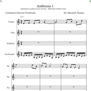 Small Ensemble Harp,Percussion,Trumpet,Xylophone - Level 5 - Interactive Download SKU: A0.1079471 By Celebrity Chamber Players. By Marshall A Thomas III. This edition: Interactive Download. Classical,Film/TV. Score and parts. Duration 51. Father Ambrose Press #20bOtEPEbqW4gYSxVBYvqy. Published by Father Ambrose Press (A0.1079471). Key: C major.A confection offered in the memory and honor of Kent University's Peer Lisius.. This product was created by a member of ArrangeMe, Hal Leonard’s global self-publishing community of independent composers, arrangers, and songwriters. ArrangeMe allows for the publication of unique arrangements of both popular titles and original compositions from a wide variety of voices and backgrounds. About Interactive Downloads Interactive Downloads are dynamic sheet music files that can be viewed and altered directly in My Digital Library from any device. Interactive features include: playback, tempo control, transposition, melody instrument selection, adjustable note size, and full-screen viewing. Once you download your personalized sheet music, you can view and print it at home, school, or anywhere you want to make music, and you don’t have to be connected to the internet. Just purchase, download and play! PLEASE NOTE: All Interactive Downloads will have a watermark at the bottom of each page that will include your name, purchase date and number of copies purchased. You are only authorized to print the number of copies that you have purchased. You may not digitally distribute or print more copies than purchased for use (i.e., you may not print or digitally distribute individual copies to friends or students).