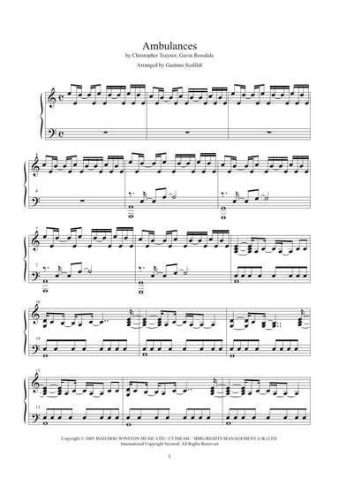Piano Solo - Level 2 - Digital Download SKU: A0.547553 By Institute. By Christopher Traynor and Gavin Rossdale. Arranged by Gaetano Scalfidi. Rock. Score. 5 pages. Gaetano Scalfidi #157266. Published by Gaetano Scalfidi (A0.547553). A melancholic ballad from 2005 by the alternative rock band Institute. This product was created by a member of ArrangeMe, Hal Leonard's global self-publishing community of independent composers, arrangers, and songwriters. ArrangeMe allows for the publication of unique arrangements of popular titles and original compositions from a variety of voices and backgrounds. The length, difficulty, and retail pricing are determined solely by the discretion of the person who arranged or composed it. About Digital Downloads Digital Downloads are downloadable sheet music files that can be viewed directly on your computer, tablet or mobile device. Once you download your digital sheet music, you can view and print it at home, school, or anywhere you want to make music, and you don’t have to be connected to the internet. Just purchase, download and play! PLEASE NOTE: Your Digital Download will have a watermark at the bottom of each page that will include your name, purchase date and number of copies purchased. You are only authorized to print the number of copies that you have purchased. You may not digitally distribute or print more copies than purchased for use (i.e., you may not print or digitally distribute individual copies to friends or students).