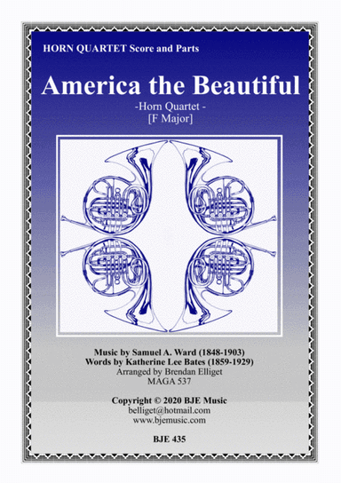 Brass Ensemble Horn - Level 2 - Digital Download SKU: A0.750973 Composed by Samuel A. Ward 1895. Arranged by Brendan Elliget MAGA 537. Patriotic. Score and parts. 10 pages. BJE Music #5788925. Published by BJE Music (A0.750973). "America the Beautiful" is an American patriotic song. The lyrics were written by Katharine Lee Bates, and the music was composed by church organist and choirmaster Samuel A. Ward at Grace Episcopal Church in Newark, New Jersey. The two never met. Bates originally wrote the words as a poem, "Pikes Peak", first published in the Fourth of July edition of the church periodical The Congregationalist in 1895. At that time, the poem was titled "America" for publication. Ward had originally written the music, "Materna", for the hymn "O Mother dear, Jerusalem" in 1882, though it was not first published until 1892. Ward's music combined with the Bates poem was first published in 1910 and titled "America the Beautiful". The song is one of the most popular of the many U.S. patriotic songs. [Wikipedia]It has been arranged here for a Horn Quartet [Key of F]. There is also an optional Piano Part (Not shown on the score).The MP3 was recorded with NotePerformer 3.Grade = 2.5 Duration = 1:40 mins (2 verses) This product was created by a member of ArrangeMe, Hal Leonard's global self-publishing community of independent composers, arrangers, and songwriters. ArrangeMe allows for the publication of unique arrangements of popular titles and original compositions from a variety of voices and backgrounds. The length, difficulty, and retail pricing are determined solely by the discretion of the person who arranged or composed it. About Digital Downloads Digital Downloads are downloadable sheet music files that can be viewed directly on your computer, tablet or mobile device. Once you download your digital sheet music, you can view and print it at home, school, or anywhere you want to make music, and you don’t have to be connected to the internet. Just purchase, download and play! PLEASE NOTE: Your Digital Download will have a watermark at the bottom of each page that will include your name, purchase date and number of copies purchased. You are only authorized to print the number of copies that you have purchased. You may not digitally distribute or print more copies than purchased for use (i.e., you may not print or digitally distribute individual copies to friends or students).