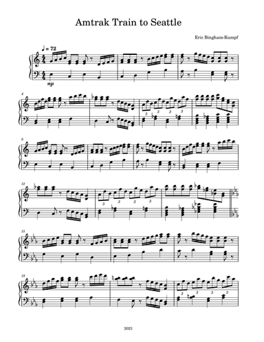 Piano Solo - Level 3 - Digital Download SKU: A0.704096 Composed by Eric Bingham-Kumpf. Contemporary,Folk. Score. 3 pages. Eric Bingham-Kumpf #6617433. Published by Eric Bingham-Kumpf (A0.704096). This product was created by a member of ArrangeMe, Hal Leonard’s global self-publishing community of independent composers, arrangers, and songwriters. ArrangeMe allows for the publication of unique arrangements of both popular titles and original compositions from a wide variety of voices and backgrounds. About Digital Downloads Digital Downloads are downloadable sheet music files that can be viewed directly on your computer, tablet or mobile device. Once you download your digital sheet music, you can view and print it at home, school, or anywhere you want to make music, and you don’t have to be connected to the internet. Just purchase, download and play! PLEASE NOTE: Your Digital Download will have a watermark at the bottom of each page that will include your name, purchase date and number of copies purchased. You are only authorized to print the number of copies that you have purchased. You may not digitally distribute or print more copies than purchased for use (i.e., you may not print or digitally distribute individual copies to friends or students).