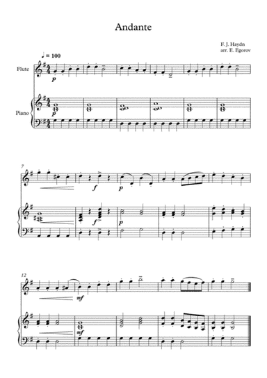 Piano,Soprano Flute - Level 1 - Digital Download SKU: A0.1240534 Composed by Franz Joseph Haydn. Arranged by Digital Book Music. Classical. Score and part. 1 pages. Digital Book Music #835917. Published by Digital Book Music (A0.1240534). Andante (Surprise Symphony) - Franz Joseph Haydn (Flute + Piano). This product was created by a member of ArrangeMe, Hal Leonard's global self-publishing community of independent composers, arrangers, and songwriters. ArrangeMe allows for the publication of unique arrangements of popular titles and original compositions from a variety of voices and backgrounds. The length, difficulty, and retail pricing are determined solely by the discretion of the person who arranged or composed it. About Digital Downloads Digital Downloads are downloadable sheet music files that can be viewed directly on your computer, tablet or mobile device. Once you download your digital sheet music, you can view and print it at home, school, or anywhere you want to make music, and you don’t have to be connected to the internet. Just purchase, download and play! PLEASE NOTE: Your Digital Download will have a watermark at the bottom of each page that will include your name, purchase date and number of copies purchased. You are only authorized to print the number of copies that you have purchased. You may not digitally distribute or print more copies than purchased for use (i.e., you may not print or digitally distribute individual copies to friends or students).