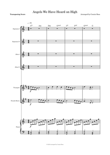 Small Ensemble Alto Voice,B-Flat Trumpet,Horn,Piano,Soprano voice - Level 3 - Digital Download SKU: A0.1122060 Composed by Unknown. Arranged by Connie Boss. Christmas,Holiday. Score and parts. 7 pages. Connie Boss #723223. Published by Connie Boss (A0.1122060). This version is very majestic with the French Horn and Trumpet. The SSAA parts are different than the normal. You can find other versions of this as well such as SATB and strings. Any questions or requests, email [email protected]. This product was created by a member of ArrangeMe, Hal Leonard's global self-publishing community of independent composers, arrangers, and songwriters. ArrangeMe allows for the publication of unique arrangements of popular titles and original compositions from a variety of voices and backgrounds. The length, difficulty, and retail pricing are determined solely by the discretion of the person who arranged or composed it. About Digital Downloads Digital Downloads are downloadable sheet music files that can be viewed directly on your computer, tablet or mobile device. Once you download your digital sheet music, you can view and print it at home, school, or anywhere you want to make music, and you don’t have to be connected to the internet. Just purchase, download and play! PLEASE NOTE: Your Digital Download will have a watermark at the bottom of each page that will include your name, purchase date and number of copies purchased. You are only authorized to print the number of copies that you have purchased. You may not digitally distribute or print more copies than purchased for use (i.e., you may not print or digitally distribute individual copies to friends or students).