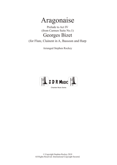 Small Ensemble Bassoon,Clarinet,Flute,Harp - Level 4 - Digital Download SKU: A0.760973 Composed by Georges Bizet. Arranged by Arranged by Stephen Rockey. Concert,Graduation,Romantic Period,Wedding. Score and parts. 18 pages. Stephen Rockey #3580307. Published by Stephen Rockey (A0.760973). Aroganaise from Carmen arranged for Flute, Clarinet in A, Bassoon and Harp. A gentle combination suitable for weddings, recitals and graduation background music. This product was created by a member of ArrangeMe, Hal Leonard's global self-publishing community of independent composers, arrangers, and songwriters. ArrangeMe allows for the publication of unique arrangements of popular titles and original compositions from a variety of voices and backgrounds. The length, difficulty, and retail pricing are determined solely by the discretion of the person who arranged or composed it. About Digital Downloads Digital Downloads are downloadable sheet music files that can be viewed directly on your computer, tablet or mobile device. Once you download your digital sheet music, you can view and print it at home, school, or anywhere you want to make music, and you don’t have to be connected to the internet. Just purchase, download and play! PLEASE NOTE: Your Digital Download will have a watermark at the bottom of each page that will include your name, purchase date and number of copies purchased. You are only authorized to print the number of copies that you have purchased. You may not digitally distribute or print more copies than purchased for use (i.e., you may not print or digitally distribute individual copies to friends or students).