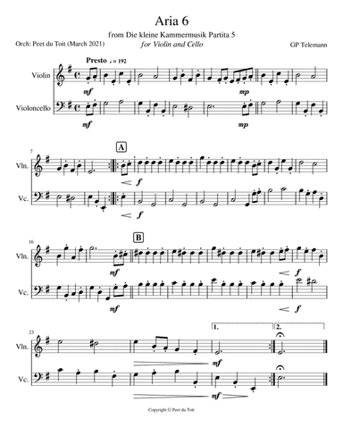 Instrumental Duet Cello,Instrumental Duet,Violin - Level 3 - Digital Download SKU: A0.802672 Composed by GP Telemann. Arranged by Peet du Toit. Baroque. Score and parts. 1 pages. Peet du Toit #6342035. Published by Peet du Toit (A0.802672). A lively presto tempo for this movement (A-part) in a minor key. Enjoy! This product was created by a member of ArrangeMe, Hal Leonard's global self-publishing community of independent composers, arrangers, and songwriters. ArrangeMe allows for the publication of unique arrangements of popular titles and original compositions from a variety of voices and backgrounds. The length, difficulty, and retail pricing are determined solely by the discretion of the person who arranged or composed it. About Digital Downloads Digital Downloads are downloadable sheet music files that can be viewed directly on your computer, tablet or mobile device. Once you download your digital sheet music, you can view and print it at home, school, or anywhere you want to make music, and you don’t have to be connected to the internet. Just purchase, download and play! PLEASE NOTE: Your Digital Download will have a watermark at the bottom of each page that will include your name, purchase date and number of copies purchased. You are only authorized to print the number of copies that you have purchased. You may not digitally distribute or print more copies than purchased for use (i.e., you may not print or digitally distribute individual copies to friends or students).