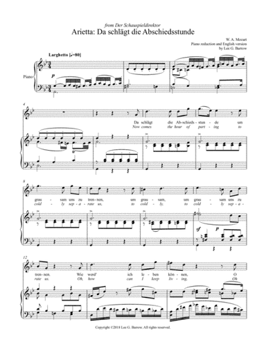 Soprano voice,Vocal Solo - Level 5 - Digital Download SKU: A0.812041 Composed by Wolfgang Amadeus Mozart. Arranged by (Editor) Lee G. Barrow. Classical,Opera,Standards. 6 pages. Bargraphica #4821509. Published by Bargraphica (A0.812041). From The Impresario (Die Schauspieldirektor). Madame Herz's arietta in the original key (F#4-D6) with piano reduction. Original German text and new English translation. This product was created by a member of ArrangeMe, Hal Leonard’s global self-publishing community of independent composers, arrangers, and songwriters. ArrangeMe allows for the publication of unique arrangements of both popular titles and original compositions from a wide variety of voices and backgrounds. About Digital Downloads Digital Downloads are downloadable sheet music files that can be viewed directly on your computer, tablet or mobile device. Once you download your digital sheet music, you can view and print it at home, school, or anywhere you want to make music, and you don’t have to be connected to the internet. Just purchase, download and play! PLEASE NOTE: Your Digital Download will have a watermark at the bottom of each page that will include your name, purchase date and number of copies purchased. You are only authorized to print the number of copies that you have purchased. You may not digitally distribute or print more copies than purchased for use (i.e., you may not print or digitally distribute individual copies to friends or students).