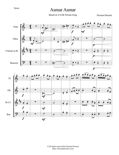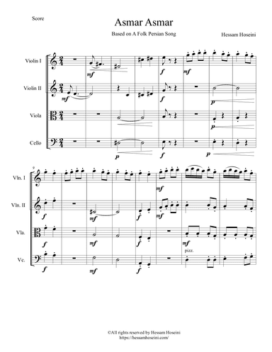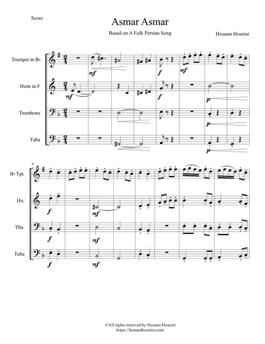 Trumpet Quartet Horn,Trombone,Trumpet,Tuba - Level 2 - Digital Download SKU: A0.1232151 Composed by Hessam Hoseini. Chamber,Classical,Folk. 8 pages. Hessamviola #827832. Published by Hessamviola (A0.1232151). Based on a Persian Folk Song This product was created by a member of ArrangeMe, Hal Leonard's global self-publishing community of independent composers, arrangers, and songwriters. ArrangeMe allows for the publication of unique arrangements of popular titles and original compositions from a variety of voices and backgrounds. The length, difficulty, and retail pricing are determined solely by the discretion of the person who arranged or composed it. About Digital Downloads Digital Downloads are downloadable sheet music files that can be viewed directly on your computer, tablet or mobile device. Once you download your digital sheet music, you can view and print it at home, school, or anywhere you want to make music, and you don’t have to be connected to the internet. Just purchase, download and play! PLEASE NOTE: Your Digital Download will have a watermark at the bottom of each page that will include your name, purchase date and number of copies purchased. You are only authorized to print the number of copies that you have purchased. You may not digitally distribute or print more copies than purchased for use (i.e., you may not print or digitally distribute individual copies to friends or students).