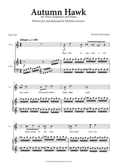 Piano,Vocal,Voice - Level 3 - Digital Download SKU: A0.1305417 By Alison Hawes. By Dominic McGonigal. 21st Century,Classical,Contemporary. Score. 4 pages. C8 Music #894861. Published by C8 Music (A0.1305417). An elegant setting of a beautiful poem by Euan Tait. The piano captures the sparkle of the raptors overhead as the singer poses questions of love and friendship. The question is answered in the harmony of singer and pianist. More at www.dominicmcgonigal.com. This product was created by a member of ArrangeMe, Hal Leonard’s global self-publishing community of independent composers, arrangers, and songwriters. ArrangeMe allows for the publication of unique arrangements of both popular titles and original compositions from a wide variety of voices and backgrounds. About Digital Downloads Digital Downloads are downloadable sheet music files that can be viewed directly on your computer, tablet or mobile device. Once you download your digital sheet music, you can view and print it at home, school, or anywhere you want to make music, and you don’t have to be connected to the internet. Just purchase, download and play! PLEASE NOTE: Your Digital Download will have a watermark at the bottom of each page that will include your name, purchase date and number of copies purchased. You are only authorized to print the number of copies that you have purchased. You may not digitally distribute or print more copies than purchased for use (i.e., you may not print or digitally distribute individual copies to friends or students).