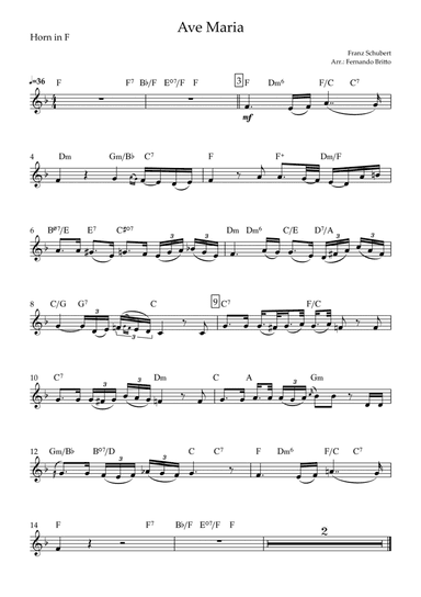 French Horn Solo - Level 2 - Digital Download SKU: A0.1194355 Composed by Franz Schubert. Arranged by Langanho. Christian,Easter,Romantic Period,Wedding. Individual part. 1 pages. Avery Lynn Jordan #793728. Published by Avery Lynn Jordan (A0.1194355). The French Horn with Chords arrangement of Schubert's Ave Maria is a beautiful piece that is perfect for music education. It is suitable for both professional musicians and beginners and provides an excellent opportunity to practice musical expression and technique. This arrangement can be easily adapted for various skill levels, making it a versatile choice for any student. Investing in this arrangement of Ave Maria will be a valuable addition to any music education program, helping to create a deeper understanding and appreciation of classical music. This product was created by a member of ArrangeMe, Hal Leonard's global self-publishing community of independent composers, arrangers, and songwriters. ArrangeMe allows for the publication of unique arrangements of popular titles and original compositions from a variety of voices and backgrounds. The length, difficulty, and retail pricing are determined solely by the discretion of the person who arranged or composed it. About Digital Downloads Digital Downloads are downloadable sheet music files that can be viewed directly on your computer, tablet or mobile device. Once you download your digital sheet music, you can view and print it at home, school, or anywhere you want to make music, and you don’t have to be connected to the internet. Just purchase, download and play! PLEASE NOTE: Your Digital Download will have a watermark at the bottom of each page that will include your name, purchase date and number of copies purchased. You are only authorized to print the number of copies that you have purchased. You may not digitally distribute or print more copies than purchased for use (i.e., you may not print or digitally distribute individual copies to friends or students).