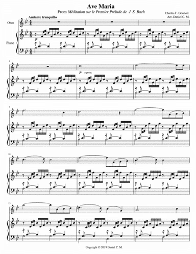 Oboe,Piano - Level 2 - Digital Download SKU: A0.810106 Composed by Johann Sebastian Bach, Charles Gounod. Arranged by Daniel C. M. Baroque,Concert,Romantic Period,Standards,Wedding. Score and part. 4 pages. Daniel C. M. #4985403. Published by Daniel C. M. (A0.810106). This beautiful work of art is now arranged for oboe and piano. The melody and the accompaniment are basically the same as the original for violin by Gounod. The key is changed to B flat so that the oboe is not too high. The PDF file includes the score (three pages) and the oboe part (one page).You can find this work in the original key (C major) published by Daniel C. M. This product was created by a member of ArrangeMe, Hal Leonard's global self-publishing community of independent composers, arrangers, and songwriters. ArrangeMe allows for the publication of unique arrangements of popular titles and original compositions from a variety of voices and backgrounds. The length, difficulty, and retail pricing are determined solely by the discretion of the person who arranged or composed it. About Digital Downloads Digital Downloads are downloadable sheet music files that can be viewed directly on your computer, tablet or mobile device. Once you download your digital sheet music, you can view and print it at home, school, or anywhere you want to make music, and you don’t have to be connected to the internet. Just purchase, download and play! PLEASE NOTE: Your Digital Download will have a watermark at the bottom of each page that will include your name, purchase date and number of copies purchased. You are only authorized to print the number of copies that you have purchased. You may not digitally distribute or print more copies than purchased for use (i.e., you may not print or digitally distribute individual copies to friends or students).