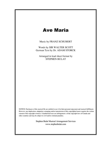 Large Ensemble Alto Recorder,Bassoon,Clarinet,English Horn,Flute,Guitar,Harpsichord,Oboe,Organ,Piano,Soprano Recorder,Tenor Recorder,Trumpet,Ukulele,Viola,Violin,Voice - Digital Download SKU: A0.858362 Composed by Franz Schubert. Arranged by Stephen Bulat. Classical,Holiday,Love,Praise & Worship,Romantic Period,Wedding. Score and parts. 3 pages. Stephen Bulat Publishing #4280241. Published by Stephen Bulat Publishing (A0.858362). Lead sheet (melody & chords) of Schubert's classical masterpiece. Rehearsal markings throughout to facilitate an easy roadmap for musicians to follow. Please click on the publisher to view this song in other keys as well as to purchase it in the "Classical Wedding Fake Book" or the "Classic Love Songs - A Valentine's Day Fake Book". This product was created by a member of ArrangeMe, Hal Leonard’s global self-publishing community of independent composers, arrangers, and songwriters. ArrangeMe allows for the publication of unique arrangements of both popular titles and original compositions from a wide variety of voices and backgrounds. About Digital Downloads Digital Downloads are downloadable sheet music files that can be viewed directly on your computer, tablet or mobile device. Once you download your digital sheet music, you can view and print it at home, school, or anywhere you want to make music, and you don’t have to be connected to the internet. Just purchase, download and play! PLEASE NOTE: Your Digital Download will have a watermark at the bottom of each page that will include your name, purchase date and number of copies purchased. You are only authorized to print the number of copies that you have purchased. You may not digitally distribute or print more copies than purchased for use (i.e., you may not print or digitally distribute individual copies to friends or students).