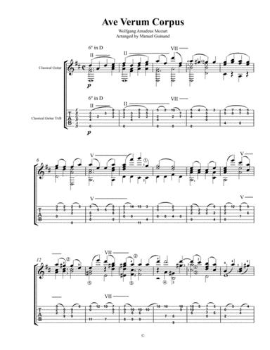 Guitar - Level 4 - Digital Download SKU: A0.922437 Composed by Wolfgang Amadeus Mozart. Arranged by Manuel Guinand. Classical. Guitar Tab. 3 pages. Manuel Guinand #5319819. Published by Manuel Guinand (A0.922437). Arrangement for Classical Guitar of the motet by Wolfgang Amadeus Mozart "Ave Verum Corpus"Original Key. Ideal for intermediate players.Social media: @manuelguinand (Instagram and Twitter)Email: [email protected] This product was created by a member of ArrangeMe, Hal Leonard’s global self-publishing community of independent composers, arrangers, and songwriters. ArrangeMe allows for the publication of unique arrangements of both popular titles and original compositions from a wide variety of voices and backgrounds. About Digital Downloads Digital Downloads are downloadable sheet music files that can be viewed directly on your computer, tablet or mobile device. Once you download your digital sheet music, you can view and print it at home, school, or anywhere you want to make music, and you don’t have to be connected to the internet. Just purchase, download and play! PLEASE NOTE: Your Digital Download will have a watermark at the bottom of each page that will include your name, purchase date and number of copies purchased. You are only authorized to print the number of copies that you have purchased. You may not digitally distribute or print more copies than purchased for use (i.e., you may not print or digitally distribute individual copies to friends or students).