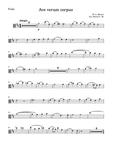 Piano Solo - Level 1 - Digital Download SKU: A0.893564 By Daniel Castillo. By Wolfgang Amadeus Mozart. Arranged by Daniel Castillo. Classical,Sacred,Wedding. Score. 2 pages. Daniel C. M. #499854. Published by Daniel C. M. (A0.893564). This is a very easy arrangement for piano solo. Many secondary voices have been removed and only the main voice of the sopranos has been left, but keeping the harmony the same as the original. This product was created by a member of ArrangeMe, Hal Leonard’s global self-publishing community of independent composers, arrangers, and songwriters. ArrangeMe allows for the publication of unique arrangements of both popular titles and original compositions from a wide variety of voices and backgrounds. About Digital Downloads Digital Downloads are downloadable sheet music files that can be viewed directly on your computer, tablet or mobile device. Once you download your digital sheet music, you can view and print it at home, school, or anywhere you want to make music, and you don’t have to be connected to the internet. Just purchase, download and play! PLEASE NOTE: Your Digital Download will have a watermark at the bottom of each page that will include your name, purchase date and number of copies purchased. You are only authorized to print the number of copies that you have purchased. You may not digitally distribute or print more copies than purchased for use (i.e., you may not print or digitally distribute individual copies to friends or students).