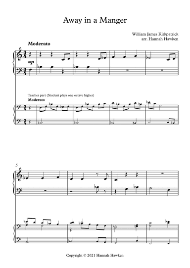 Easy Piano - Level 1 - Digital Download SKU: A0.752581 Composed by William J. Kirkpatrick. Arranged by Hannah Hawken. Children,Christian,Christmas,Romantic Period. Score. 4 pages. Hannah Hawken #6642617. Published by Hannah Hawken (A0.752581). This is a beginner piano arrangement of the William J. Kirkpatrick Cradle Song, the most commonly used tune for "Away in a Manger" in the UK and Ireland and other countries outside of the US. I've transposed the melody to Bb major so it can be played by beginner pianists in Middle C Position and the flats are written as accidentals rather than a key signature. This would be a great piece to use to introduce flats or quavers to beginners using a familiar melody.The optional teacher part really fills out the arrangement for performances. This product was created by a member of ArrangeMe, Hal Leonard's global self-publishing community of independent composers, arrangers, and songwriters. ArrangeMe allows for the publication of unique arrangements of popular titles and original compositions from a variety of voices and backgrounds. The length, difficulty, and retail pricing are determined solely by the discretion of the person who arranged or composed it. About Digital Downloads Digital Downloads are downloadable sheet music files that can be viewed directly on your computer, tablet or mobile device. Once you download your digital sheet music, you can view and print it at home, school, or anywhere you want to make music, and you don’t have to be connected to the internet. Just purchase, download and play! PLEASE NOTE: Your Digital Download will have a watermark at the bottom of each page that will include your name, purchase date and number of copies purchased. You are only authorized to print the number of copies that you have purchased. You may not digitally distribute or print more copies than purchased for use (i.e., you may not print or digitally distribute individual copies to friends or students).