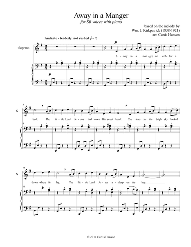 Choral Choir (2-Part) - Level 1 - Digital Download SKU: A0.1112431 Composed by William J. Kirkpatrick - James R. Murray. Arranged by Curtis Hanson. Christmas,Holiday,Sacred. Octavo. 5 pages. Curtis Hanson #714465. Published by Curtis Hanson (A0.1112431). In this post-pandemic era, demand for octavos for smaller choirs is on the rise. Here is an arrangement for SB chorus of the lovely melody by William J. Kirkpatrick juxtaposed with the familiar carol melody by James R. Murray. The bass part very briefly divides near the end of the piece. The accompaniment would most likely be played on piano, but a harp or guitar or electronic keyboard using those settings would provide a wonderful color. It is sure to be a favorite for both choir and audience. This would be a welcome addition to the library with minimal voices. It is also available for expanded choral voicing. It would also work as a duet. This product was created by a member of ArrangeMe, Hal Leonard’s global self-publishing community of independent composers, arrangers, and songwriters. ArrangeMe allows for the publication of unique arrangements of both popular titles and original compositions from a wide variety of voices and backgrounds. About Digital Downloads Digital Downloads are downloadable sheet music files that can be viewed directly on your computer, tablet or mobile device. Once you download your digital sheet music, you can view and print it at home, school, or anywhere you want to make music, and you don’t have to be connected to the internet. Just purchase, download and play! PLEASE NOTE: Your Digital Download will have a watermark at the bottom of each page that will include your name, purchase date and number of copies purchased. You are only authorized to print the number of copies that you have purchased. You may not digitally distribute or print more copies than purchased for use (i.e., you may not print or digitally distribute individual copies to friends or students).