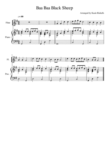 Flute,Piano - Level 1 - Digital Download SKU: A0.1236037 Composed by English nursery rhyme. Arranged by Lynette Auberjeunois. Chamber,Children,Contest,Festival,Folk. Score and part. 6 pages. Flute Files Publishing #831544. Published by Flute Files Publishing (A0.1236037). "Baa! Baa! Black Sheep" flute solo sheet music. English nursery rhyme arranged by Lynette Auberjeunois for late beginner level. Digital download in the key of G includes a one page flute solo and a two page piano score. Range: G1 to E2. Published by Flute Files Publishing (FO70-1009). This product was created by a member of ArrangeMe, Hal Leonard’s global self-publishing community of independent composers, arrangers, and songwriters. ArrangeMe allows for the publication of unique arrangements of both popular titles and original compositions from a wide variety of voices and backgrounds. About Digital Downloads Digital Downloads are downloadable sheet music files that can be viewed directly on your computer, tablet or mobile device. Once you download your digital sheet music, you can view and print it at home, school, or anywhere you want to make music, and you don’t have to be connected to the internet. Just purchase, download and play! PLEASE NOTE: Your Digital Download will have a watermark at the bottom of each page that will include your name, purchase date and number of copies purchased. You are only authorized to print the number of copies that you have purchased. You may not digitally distribute or print more copies than purchased for use (i.e., you may not print or digitally distribute individual copies to friends or students).