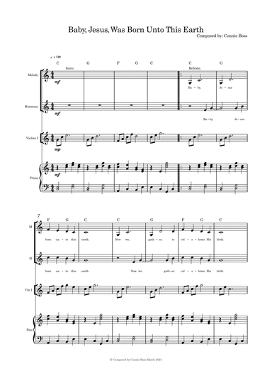 Piano,Voice Duet Piano,Voice - Level 2 - Digital Download SKU: A0.801635 Composed by Connie Boss. Christmas,Sacred. 3 pages. Connie Boss #6340313. Published by Connie Boss (A0.801635). What a difference it made, from the birth of this babe. Baby, Jesus, was born unto this earth. We celebrate His birth. This is an original song with moving parts. [email protected]:Baby, JesusComposed by Connie Boss Refrain:Baby, Jesus, was born unto this EarthNow we, gather, to celebrate His birth Verse 1:Born of Mary pure andJoseph who was sure, the World would change that day, in aVery special way Refrain: Verse 2:Born to right the wrong, weCelebrate in song, with,Hymns of praise and joy, to thisLittle baby boy Refrain: Verse 3:Shepherds came that day, toBow and then to pray, theAngels came to sing, to theNewborn baby King Bridge:What a difference it made, from theBirth of this babe. TheDark became light, itBrought them new sight. Alleluia, Alleluia, Alleluia  This product was created by a member of ArrangeMe, Hal Leonard's global self-publishing community of independent composers, arrangers, and songwriters. ArrangeMe allows for the publication of unique arrangements of popular titles and original compositions from a variety of voices and backgrounds. The length, difficulty, and retail pricing are determined solely by the discretion of the person who arranged or composed it. About Digital Downloads Digital Downloads are downloadable sheet music files that can be viewed directly on your computer, tablet or mobile device. Once you download your digital sheet music, you can view and print it at home, school, or anywhere you want to make music, and you don’t have to be connected to the internet. Just purchase, download and play! PLEASE NOTE: Your Digital Download will have a watermark at the bottom of each page that will include your name, purchase date and number of copies purchased. You are only authorized to print the number of copies that you have purchased. You may not digitally distribute or print more copies than purchased for use (i.e., you may not print or digitally distribute individual copies to friends or students).