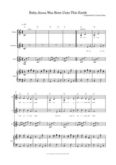 Piano,Voice Duet Piano,Voice - Level 2 - Digital Download SKU: A0.801636 Composed by Connie Boss. Celtic,Christmas,Irish,Sacred. 4 pages. Connie Boss #6357783. Published by Connie Boss (A0.801636). What a difference it made, from the birth of this babe. Baby, Jesus, was born unto this earth. We celebrate His birth. This is an original song with moving parts. [email protected]:Baby, JesusComposed by Connie Boss Refrain:Baby, Jesus, was born unto this EarthNow we, gather, to celebrate His birth Verse 1:Born of Mary pure andJoseph who was sure, the World would change that day, in aVery special way Refrain: Verse 2:Born to right the wrong, weCelebrate in song, with,Hymns of praise and joy, to thisLittle baby boy Refrain: Verse 3:Shepherds came that day, toBow and then to pray, theAngels came to sing, to theNewborn baby King Bridge:What a difference it made, from theBirth of this babe. TheDark became light, itBrought them new sight. Alleluia, Alleluia, Alleluia This product was created by a member of ArrangeMe, Hal Leonard’s global self-publishing community of independent composers, arrangers, and songwriters. ArrangeMe allows for the publication of unique arrangements of both popular titles and original compositions from a wide variety of voices and backgrounds. About Digital Downloads Digital Downloads are downloadable sheet music files that can be viewed directly on your computer, tablet or mobile device. Once you download your digital sheet music, you can view and print it at home, school, or anywhere you want to make music, and you don’t have to be connected to the internet. Just purchase, download and play! PLEASE NOTE: Your Digital Download will have a watermark at the bottom of each page that will include your name, purchase date and number of copies purchased. You are only authorized to print the number of copies that you have purchased. You may not digitally distribute or print more copies than purchased for use (i.e., you may not print or digitally distribute individual copies to friends or students).