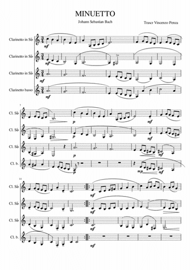 Woodwind Ensemble,Woodwind Quartet Clarinet - Digital Download SKU: A0.1031558 Composed by Johann Sebastian Bach. Arranged by Vincenzo Penza. Baroque. 7 pages. Vincenzo Penza #4321347. Published by Vincenzo Penza (A0.1031558). Attributo per decenni all'autore del genere, fu scoperto solo intorno al 1970 che il Minuetto in Sol minore era opera di Christian Petzold, compositore e organista tedesco morto nel 1733. Ma nella pratica comune il titolo dello spartito continua ancora oggi essere avvicinato inesorabilmente a Bach. È un pezzo scritto nello stile del tempo, in sol minore, con una breve digressione centrale nella relativa maggiore. This product was created by a member of ArrangeMe, Hal Leonard’s global self-publishing community of independent composers, arrangers, and songwriters. ArrangeMe allows for the publication of unique arrangements of both popular titles and original compositions from a wide variety of voices and backgrounds. About Digital Downloads Digital Downloads are downloadable sheet music files that can be viewed directly on your computer, tablet or mobile device. Once you download your digital sheet music, you can view and print it at home, school, or anywhere you want to make music, and you don’t have to be connected to the internet. Just purchase, download and play! PLEASE NOTE: Your Digital Download will have a watermark at the bottom of each page that will include your name, purchase date and number of copies purchased. You are only authorized to print the number of copies that you have purchased. You may not digitally distribute or print more copies than purchased for use (i.e., you may not print or digitally distribute individual copies to friends or students).