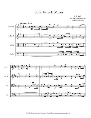 String Quartet String Quartet - Level 4 - Digital Download SKU: A0.732772 Composed by Johann Sebastian Bach. Arranged by Dave Prudon. Baroque,Christmas,Easter,Sacred,Wedding. Score and parts. 30 pages. Prudon String Ensembles #6690273. Published by Prudon String Ensembles (A0.732772). String Quartets will love playing this nicely-written arrangement of the Overture from Bach's Suite #2 in B Minor.  The majesty of the opening adagio section coupled with the excitement of the following Allegro, makes this arrangement a thrill to play.  Since this arranger is a former orchestral violinist, he carefully laid out the parts in such a way as to eliminate nasty page turns.  To see other Baroque masterpieces arranged for String Quartet, along with many other string arrangements, take a peek at:  Prudon String Ensembles Sheet Music, here on SMP.com. This product was created by a member of ArrangeMe, Hal Leonard’s global self-publishing community of independent composers, arrangers, and songwriters. ArrangeMe allows for the publication of unique arrangements of both popular titles and original compositions from a wide variety of voices and backgrounds. About Digital Downloads Digital Downloads are downloadable sheet music files that can be viewed directly on your computer, tablet or mobile device. Once you download your digital sheet music, you can view and print it at home, school, or anywhere you want to make music, and you don’t have to be connected to the internet. Just purchase, download and play! PLEASE NOTE: Your Digital Download will have a watermark at the bottom of each page that will include your name, purchase date and number of copies purchased. You are only authorized to print the number of copies that you have purchased. You may not digitally distribute or print more copies than purchased for use (i.e., you may not print or digitally distribute individual copies to friends or students).