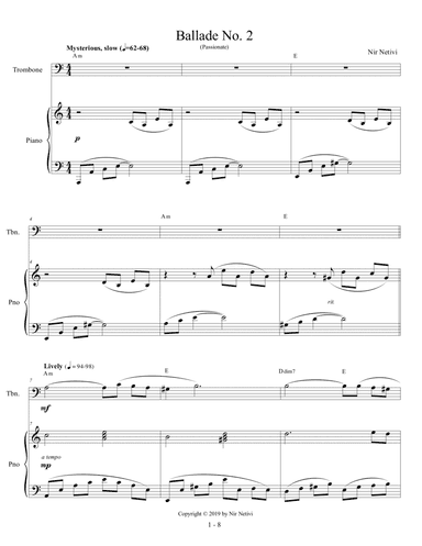 Instrumental Duet,Piano Instrumental Duet,Piano,Trombone,Voice - Level 4 - Digital Download SKU: A0.1019765 Composed by Nir Netivi. 20th Century,Contemporary. Score and parts. 8 pages. Nir Netivi #6624617. Published by Nir Netivi (A0.1019765). Very lyrical and delicate,  features a wondaful duet between the piano and the trombone. This product was created by a member of ArrangeMe, Hal Leonard's global self-publishing community of independent composers, arrangers, and songwriters. ArrangeMe allows for the publication of unique arrangements of popular titles and original compositions from a variety of voices and backgrounds. The length, difficulty, and retail pricing are determined solely by the discretion of the person who arranged or composed it. About Digital Downloads Digital Downloads are downloadable sheet music files that can be viewed directly on your computer, tablet or mobile device. Once you download your digital sheet music, you can view and print it at home, school, or anywhere you want to make music, and you don’t have to be connected to the internet. Just purchase, download and play! PLEASE NOTE: Your Digital Download will have a watermark at the bottom of each page that will include your name, purchase date and number of copies purchased. You are only authorized to print the number of copies that you have purchased. You may not digitally distribute or print more copies than purchased for use (i.e., you may not print or digitally distribute individual copies to friends or students).