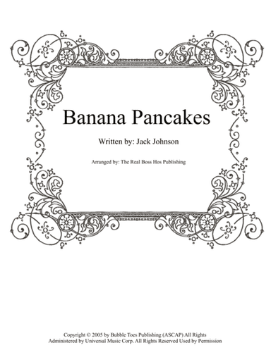 Ukulele - Level 3 - Digital Download SKU: A0.1302913 By Jack Johnson. By Jack Johnson. Arranged by Daniel Roberts. 21st Century,Contemporary,Film/TV,Pop,Singer/Songwriter. Score. 7 pages. Daniel P Roberts #892526. Published by Daniel P Roberts (A0.1302913). Banana Pancakes by Jack Johnson. Guitar parts arranged for Ukulele with Tab. This product was created by a member of ArrangeMe, Hal Leonard's global self-publishing community of independent composers, arrangers, and songwriters. ArrangeMe allows for the publication of unique arrangements of popular titles and original compositions from a variety of voices and backgrounds. The length, difficulty, and retail pricing are determined solely by the discretion of the person who arranged or composed it. About Digital Downloads Digital Downloads are downloadable sheet music files that can be viewed directly on your computer, tablet or mobile device. Once you download your digital sheet music, you can view and print it at home, school, or anywhere you want to make music, and you don’t have to be connected to the internet. Just purchase, download and play! PLEASE NOTE: Your Digital Download will have a watermark at the bottom of each page that will include your name, purchase date and number of copies purchased. You are only authorized to print the number of copies that you have purchased. You may not digitally distribute or print more copies than purchased for use (i.e., you may not print or digitally distribute individual copies to friends or students).