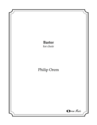 Choral Choir (SATB) - Level 3 - Digital Download SKU: A0.872702 Composed by Philip Orem. Contemporary. Octavo. 7 pages. Philip Orem #6480905. Published by Philip Orem (A0.872702). My setting of Sara Teasdale's poem Barter for SATB with divisi choir. This is a lovely, evocative poem with lush harmonies and excellent word painting. A piano  reduction is included.We're on the honor system here, please buy as many copies as you have performers. Printing more copies than you purchase is a violation of the copyright.For further information contact me at [email protected]  or https://po4musik.wixsite.com/website This product was created by a member of ArrangeMe, Hal Leonard's global self-publishing community of independent composers, arrangers, and songwriters. ArrangeMe allows for the publication of unique arrangements of popular titles and original compositions from a variety of voices and backgrounds. The length, difficulty, and retail pricing are determined solely by the discretion of the person who arranged or composed it. About Digital Downloads Digital Downloads are downloadable sheet music files that can be viewed directly on your computer, tablet or mobile device. Once you download your digital sheet music, you can view and print it at home, school, or anywhere you want to make music, and you don’t have to be connected to the internet. Just purchase, download and play! PLEASE NOTE: Your Digital Download will have a watermark at the bottom of each page that will include your name, purchase date and number of copies purchased. You are only authorized to print the number of copies that you have purchased. You may not digitally distribute or print more copies than purchased for use (i.e., you may not print or digitally distribute individual copies to friends or students).