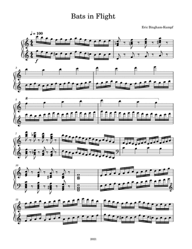 Piano Solo - Level 5 - Digital Download SKU: A0.704047 Composed by Eric Bingham-Kumpf. Contemporary. Score. 4 pages. Eric Bingham-Kumpf #6527241. Published by Eric Bingham-Kumpf (A0.704047). This product was created by a member of ArrangeMe, Hal Leonard’s global self-publishing community of independent composers, arrangers, and songwriters. ArrangeMe allows for the publication of unique arrangements of both popular titles and original compositions from a wide variety of voices and backgrounds. About Digital Downloads Digital Downloads are downloadable sheet music files that can be viewed directly on your computer, tablet or mobile device. Once you download your digital sheet music, you can view and print it at home, school, or anywhere you want to make music, and you don’t have to be connected to the internet. Just purchase, download and play! PLEASE NOTE: Your Digital Download will have a watermark at the bottom of each page that will include your name, purchase date and number of copies purchased. You are only authorized to print the number of copies that you have purchased. You may not digitally distribute or print more copies than purchased for use (i.e., you may not print or digitally distribute individual copies to friends or students).