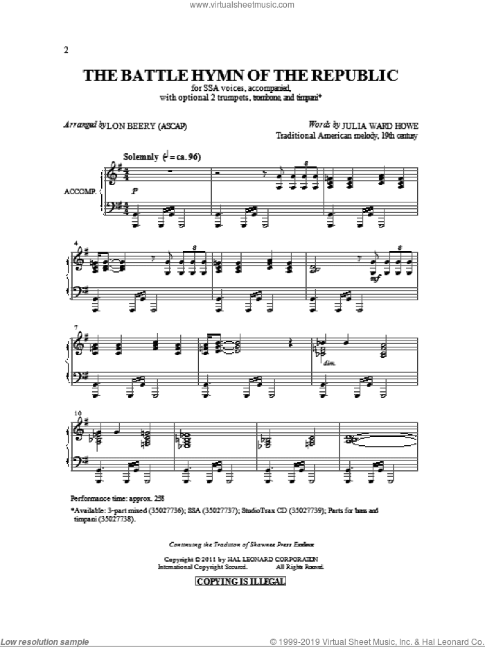 Digital sheet music for choir (SSA: soprano, alto)NOTE: lyrics included, chord indications may be included (please, check the first page above before to buy this item to see what's included)Publisher: Hal LeonardContributors to this music title:Julia Ward Howe (composer)Lon Beery (arranger, writer)This item includes: PDF (digital sheet music to download and print), Interactive Sheet Music (for online playback, transposition and printing). You can transpose this music in any key.Instrumentation:choir (SSA: soprano, alto)Skill Level:intermediateGenre:concertPages:7