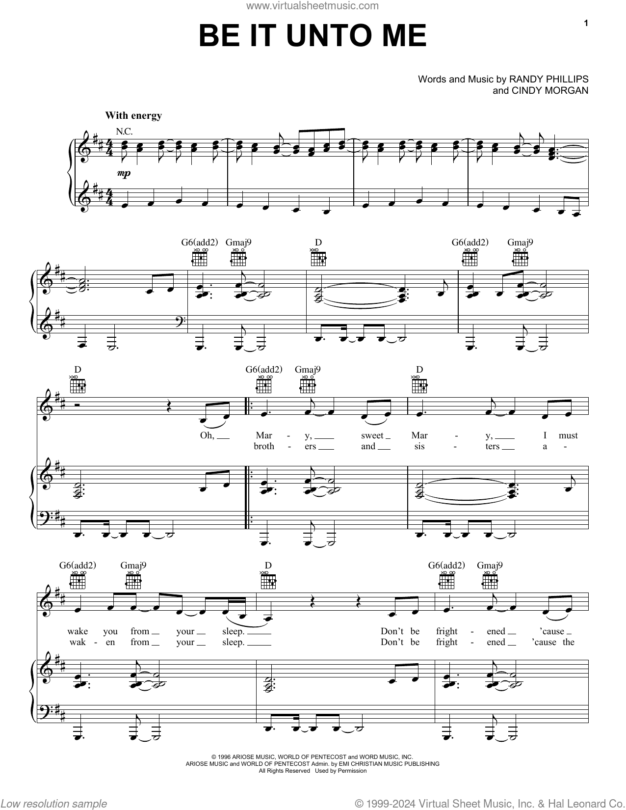 Digital sheet music for voice, piano or guitarNOTE: Chords, lead sheet indications and lyrics may be included (please check the first page above before to buy this item to see what's included)Publisher: Hal LeonardContributors to this music title:Cindy Morgan (writer)Randy Phillips (writer)This item includes: PDF (digital sheet music to download and print), Interactive Sheet Music (for online playback, transposition and printing). You can transpose this music in any key.Furthermore, this item includes the ability to ask our AI Music Assistant up to 100 in-context questions a day [learn more].Instrumentation:voice, piano or guitarFormat:digital sheet music, pvgSkill Level:intermediateGenre:christian, christmas, sacred, advent, carol, festivalPages:6