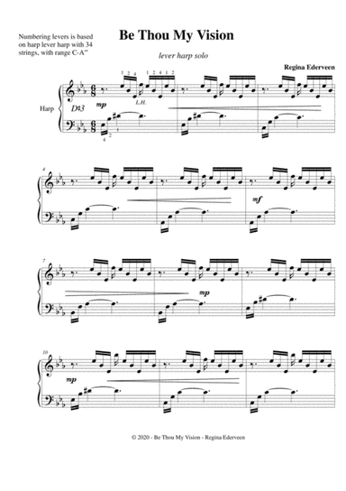 Harp - Level 4 - Digital Download SKU: A0.859412 Composed by Regina Ederveen. Celtic,Christian,Folk,Sacred,World. Score. 7 pages. R. Ederveen #5207459. Published by R. Ederveen (A0.859412). Be Thou My Vision - lever harp soloA wonderful arrangement, for lever harp or pedal harp, by Regina EderveenLength 4'23''.For information contact via www.reginaederveen.nl This product was created by a member of ArrangeMe, Hal Leonard's global self-publishing community of independent composers, arrangers, and songwriters. ArrangeMe allows for the publication of unique arrangements of popular titles and original compositions from a variety of voices and backgrounds. The length, difficulty, and retail pricing are determined solely by the discretion of the person who arranged or composed it. About Digital Downloads Digital Downloads are downloadable sheet music files that can be viewed directly on your computer, tablet or mobile device. Once you download your digital sheet music, you can view and print it at home, school, or anywhere you want to make music, and you don’t have to be connected to the internet. Just purchase, download and play! PLEASE NOTE: Your Digital Download will have a watermark at the bottom of each page that will include your name, purchase date and number of copies purchased. You are only authorized to print the number of copies that you have purchased. You may not digitally distribute or print more copies than purchased for use (i.e., you may not print or digitally distribute individual copies to friends or students).