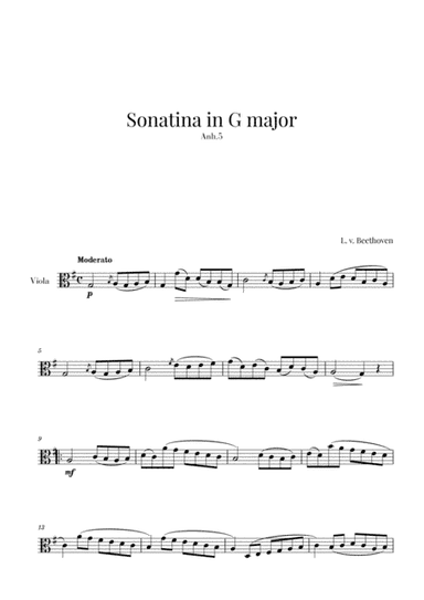 Viola Solo - Level 2 - Digital Download SKU: A0.570414 Composed by Ludwig van Beethoven. Arranged by Cadenza Editions. Children,Classical,Instructional,Standards. Individual part. 3 pages. Cadenza Editions #4837517. Published by Cadenza Editions (A0.570414). Beethoven - Sonatina in G Major (for Viola)2 movements included. This product was created by a member of ArrangeMe, Hal Leonard’s global self-publishing community of independent composers, arrangers, and songwriters. ArrangeMe allows for the publication of unique arrangements of both popular titles and original compositions from a wide variety of voices and backgrounds. About Digital Downloads Digital Downloads are downloadable sheet music files that can be viewed directly on your computer, tablet or mobile device. Once you download your digital sheet music, you can view and print it at home, school, or anywhere you want to make music, and you don’t have to be connected to the internet. Just purchase, download and play! PLEASE NOTE: Your Digital Download will have a watermark at the bottom of each page that will include your name, purchase date and number of copies purchased. You are only authorized to print the number of copies that you have purchased. You may not digitally distribute or print more copies than purchased for use (i.e., you may not print or digitally distribute individual copies to friends or students).