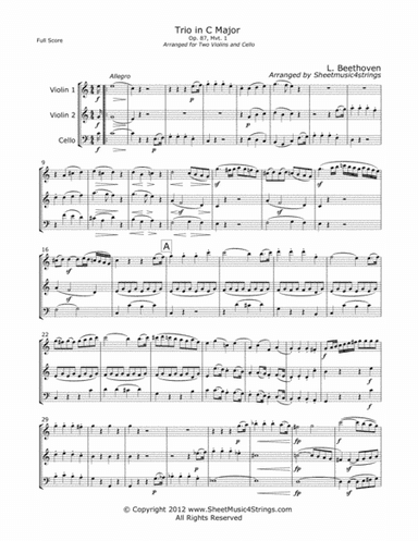 String Ensemble,String Trio Cello,Violin - Level 5 - Digital Download SKU: A0.540436 Composed by Ludwig van Beethoven. Arranged by Linda Scott. Classical. Score and parts. 21 pages. Linda M Scott #4286549. Published by Linda M Scott (A0.540436). Ludwig van Beethoven (1770 - 1827) was a German composer and pianist. He stands as one of the most famous and influential of all composers. This arrangement for two violins and cello is based on the first movement of his Trio in C, Op. 87 for Two Oboes and English Horn. This product was created by a member of ArrangeMe, Hal Leonard’s global self-publishing community of independent composers, arrangers, and songwriters. ArrangeMe allows for the publication of unique arrangements of both popular titles and original compositions from a wide variety of voices and backgrounds. About Digital Downloads Digital Downloads are downloadable sheet music files that can be viewed directly on your computer, tablet or mobile device. Once you download your digital sheet music, you can view and print it at home, school, or anywhere you want to make music, and you don’t have to be connected to the internet. Just purchase, download and play! PLEASE NOTE: Your Digital Download will have a watermark at the bottom of each page that will include your name, purchase date and number of copies purchased. You are only authorized to print the number of copies that you have purchased. You may not digitally distribute or print more copies than purchased for use (i.e., you may not print or digitally distribute individual copies to friends or students).